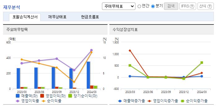 -2023년 12월 전년동기 대비 별도기준 매출액은 5.3% 증가, 영업이익은 109% 증가, 당기순이익은 80.5% 증가. 유동비율 184.8%, 부채비율 69.4%로 안정적인 재무구조 유지. 매출 다변화, 거래처 확대, 원가절감 등 사업 체질 강화로 수익성 개선됨. 높은 생산 기술력을 바탕으로 신시장 개척과 신제형, 신제품 개발로 성장을 지속하며 수익성을 확보할 계획임.