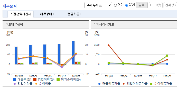 -2024년 3월 전년동기 대비 연결기준 매출액은 32.9% 증가, 영업이익은 152.3% 증가, 당기순이익은 144.2% 증가. 매출액이 두 자릿수 증가하며 영업이익과 당기순이익 모두 크게 증가하였음. 판관비는 광고선전비 28억 원이 증가하는 등 전년대비 9억 원이 증가하였음. 유통채널 다변화 및 위탁생산기업의 활용도가 증가하여 제조시설이 없는 중소기업들도 상품기획력을 바탕으로 시장에 진입하며 산업 전반의 외형적 성장이 지속되고 있음.