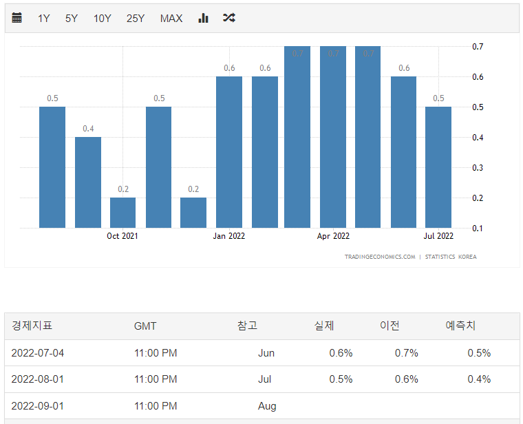 - 월간 차트는 지난달에 비해서 얼마나 변했는지 알 수 있는 차트이다. 3~5월을 피크로 물가상승률(월간) 지수는 감소하고 있어 보인다.