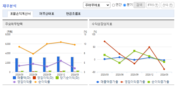 -2024년 3월 전년동기 대비 연결기준 매출액은 9.9% 증가, 영업이익은 8.3% 감소, 당기순이익은 18.8% 증가. 지주부문을 비롯하여 헬스케어, 의약품도매, 기타부문 모두 전년동기대비 매출액이 고르게 증가하여 동사의 2024년 1분기 매출에 긍정적으로 작용. 매출이 상승하였지만 광고비 및 판매촉진비, 기타 판관비 또한 상승하고 인건비 또한 증가하면서 동사의 영업이익은 감소함.