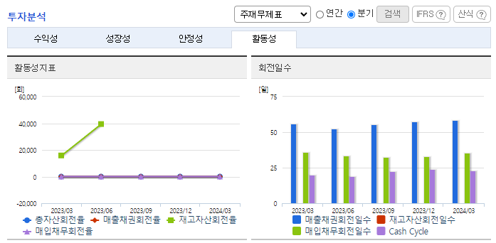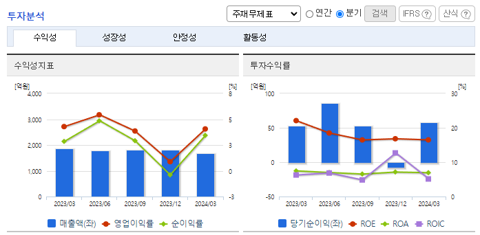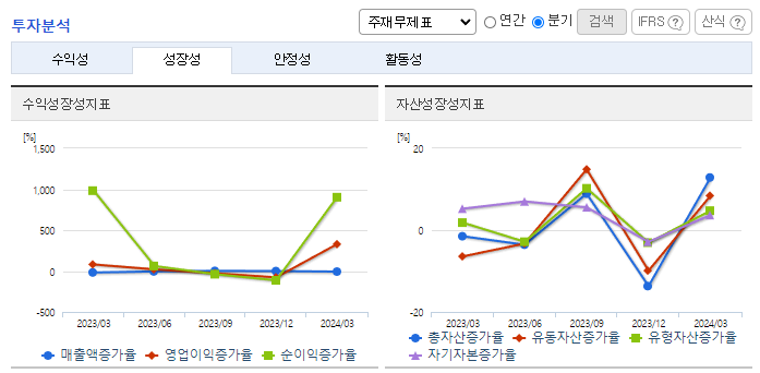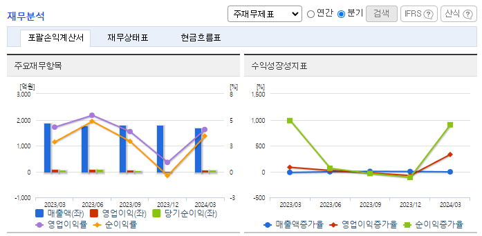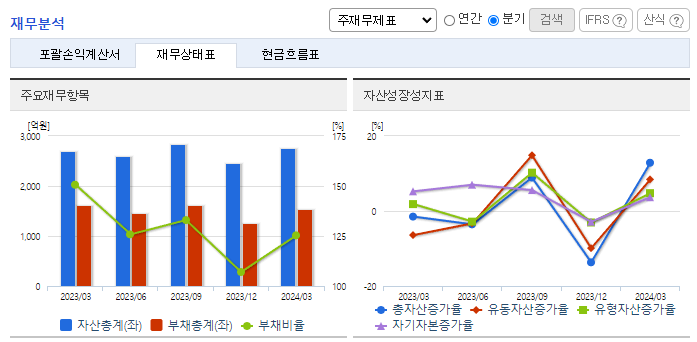 -2024년 3월 전년동기 대비 연결기준 매출액은 10.2% 감소, 영업이익은 15% 감소, 당기순이익은 8.1% 증가. 당기 자산총계는 2,451억 원으로 전기대비 10.7% 감소하였으며 당기 부채총계는 1,267억 원으로, 전기대비 26.3% 감소함. 운임 하락으로 인한 판가 인하, 러시아-우크라이나 전쟁, 중국경제 부진 등 부정적인 외부요인들 속에서 적극적인 성장 투자와 해외사업 확정을 통해 어려운 경영환경을 극복할 예정임.