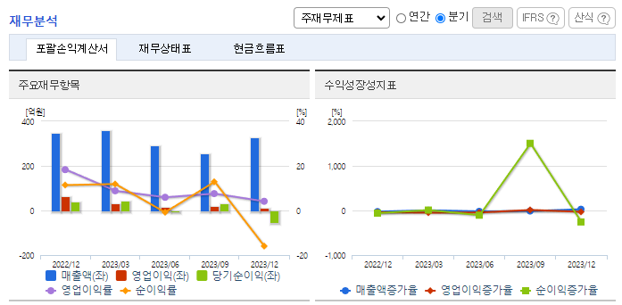 -2023년 12월 전년동기 대비 연결기준 매출액은 24.4% 감소, 영업이익은 77.2% 감소, 당기순이익은 92.5% 감소. 반도체 경기 침체 따른 고부가 모델의 매출 감소와 경영 효율성 증대 및 업무 프로세스 개선을 위한 컨설팅 비용 증가되어 판매관리비가 증가함에 따라 실적이 악화됨. 반도체 상승 사이클에 진입에 따라 반도체 산업 성장속도는 더욱 가속화할 것으로 전망. 동사는 정밀부품을 공급함으로써 실적 개선 예상.