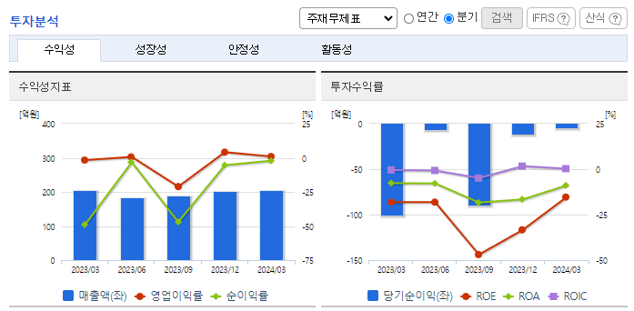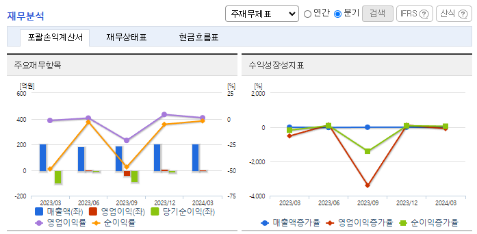 -2024년 3월 전년동기 대비 연결기준 매출액은 0.6% 증가, 영업이익은 495.2% 증가, 당기순손실은 89.5% 감소. 매출은 전년동기 수준과 유사하나 매출원가가 7.7% 감소하며 영업이익이 흑자전환함. 금융비용 감소 등 재무건전성 개선되며 당기순손실 적자폭 크게 감소함. 2024년도에 15종의 연구개발 승인을 목표로 진행하고 있으며, 매출확대를 위해 골지혈제 의료기기를 2024년 출시 준비 중임.