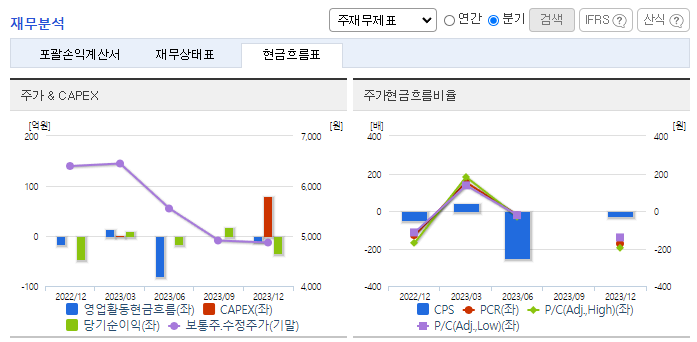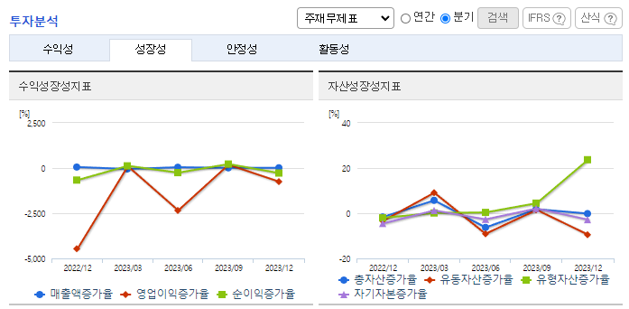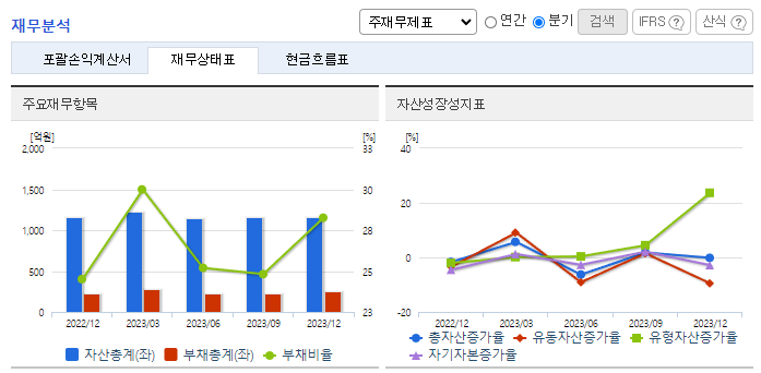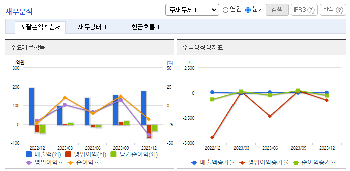 -2023년 12월 전년동기 대비 연결기준 매출액은 2.3% 증가, 영업손실은 76.9% 증가, 당기순손실은 58.3% 감소. 외형 소폭 성장에도 불구하고 원가율 악화와 판관비 등 비용 증가로 영업적자 폭이 전년 대비 더 커짐. 당기순이익도 적자 지속됨. 2024년에는 유통망정비, 설비투자 등을 통해 생산성 향상 및 수익성을 개선하고 저탄소, 에너지절감형 제품을 지속적으로 연구 개발해 매출 향상 노력할 예정임.