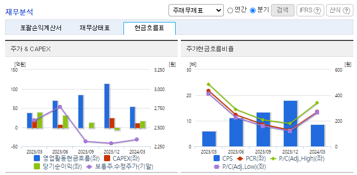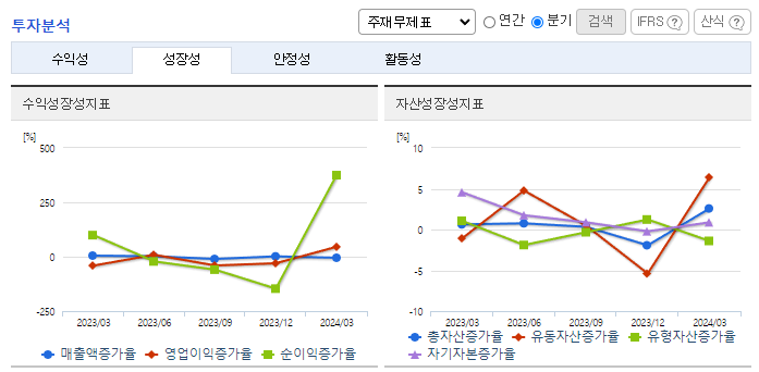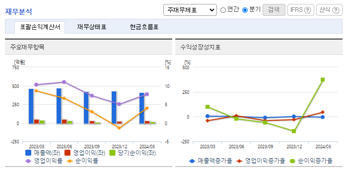 -2024년 3월 전년동기 대비 연결기준 매출액은 11.5% 감소, 영업이익은 33.8% 감소, 당기순이익은 58.3% 감소. 원가절감 노력에도 매출 감소에 따른 영향으로 수익성은 부진함. 비영업부문 비용 증가로 순이익 또한 전년동기 절반의 수준을 시현함. 동사는 이전부터 추진해 오던 생산성 향상과 스마트 공정관리를 통해 주력사업의 역량강화 및 생산 안정화를 기반으로 지속적인 성장을 이루도록 노력 중임.
