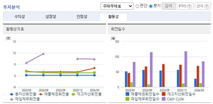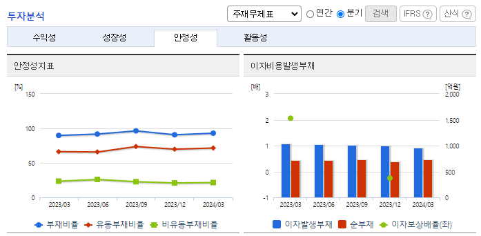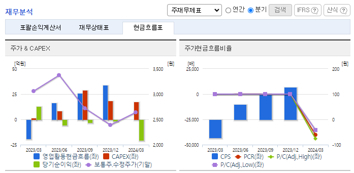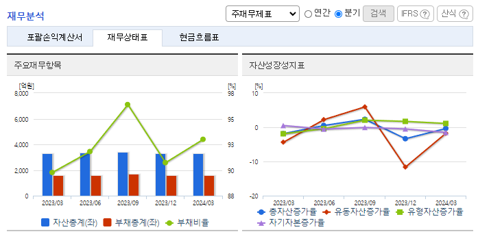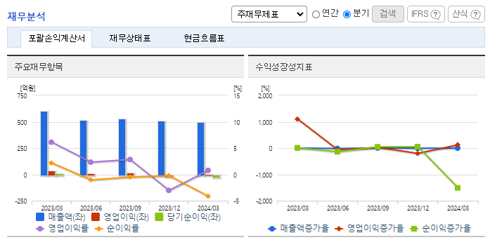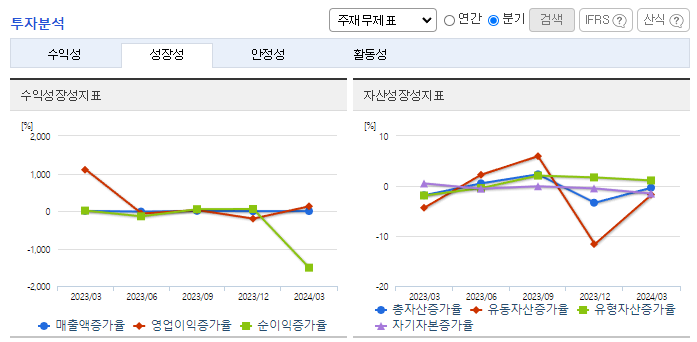 -2024년 3월 전년동기 대비 연결기준 매출액은 17.4% 감소, 영업이익은 89.7% 감소, 당기순이익 적자전환. 2024년은 상반기는 스테그플레이션(고물가, 저성장), 중국의 성장세 둔화, 미. 중 갈등심화로 인해 경기둔화가 지속 중. 하반기 금리인하를 시작으로 물가안정, 전쟁종결 등 리스크 해소 시 작년 대비 경기가 다소 회복될 것으로 희망하지만 리스크 요인은 여전함.