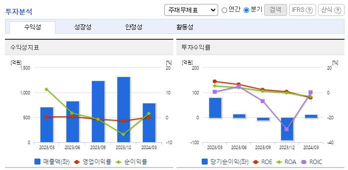 -2023년 12월 전년동기 대비 연결기준 매출액은 1,328.8% 증가, 영업손실은 257.5% 증가, 당기순이익은 86.8% 감소. 매출이 1,328.8% 증가했으나 영업손실이 257.5% 확대되며 당기순손실 546억 원으로 적자 전환함. 사업 부문별로는 기타 사업 매출이 크게 증가함. 매출액영업이익률은 회복세를 보이고 있으나 당기순이익은 여전히 관계기업에 영향을 받고 있음.