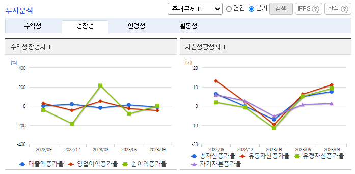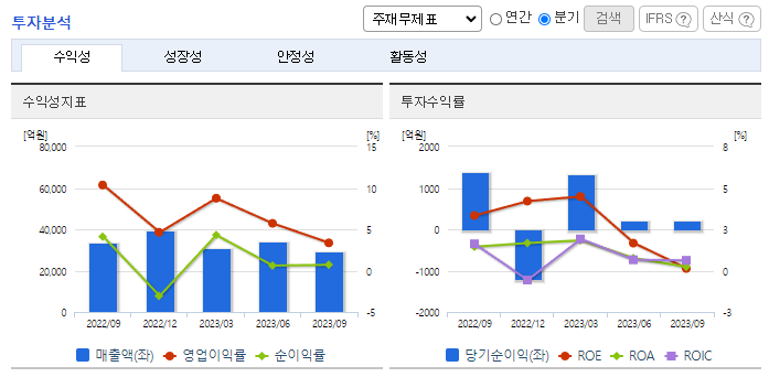 -2023년 9월 전년동기 대비 연결기준 매출액은 0.8% 증가, 영업이익은 25.4% 감소, 당기순이익은 72.9% 감소. 일부 프로젝트에 대한 협의와 매각 지연에 따라 매출액이 감소하고 원재료 투입 관련 시차 효과로 모듈 수익성이 하락하고 분산형 발전 관련 비용 등으로 영업이익은 감소하였음. 태양광 모듈 판매량 증가와 스프레드 개선, 발전사업의 개발, 매각사업이 성장하며 매출 성장과 수익성이 개선에 노력.