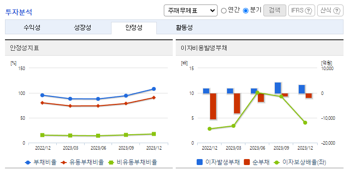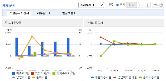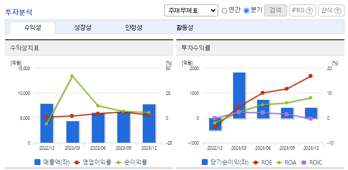 -2023년 9월 전년동기 대비 연결기준 매출액은 19.4% 증가, 영업이익은 123% 증가, 당기순이익 흑자전환. 방산 부문 양산 사업과 ICT 부문의 계열사 IT 수요로 매출 증가하여 영업이익이 전년 동기 대비 123% 증가한 716억 달성함. TICN 4차 양산, 30mm 차륜형대공포 양산 사업 등 매출 증가로 인한 영업이익 증가. 콜린스와 'Saturn' 사업 추진을 위한 계약 체결.