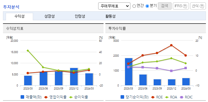 -2024년 3월 전년동기 대비 연결기준 매출액은 23.9% 증가, 영업이익은 218.1% 증가, 당기순이익은 72.2% 감소. 방산 부문 양산 사업과 ICT 부문의 계열사 IT 수요로 매출 증가하여 영업이익이 전년 동기 대비 123% 증가한 716억 달성함. TICN 4차 양산, 30mm 차륜형대공포 양산 사업 등 매출 증가로 인한 영업이익 증가. 콜린스와 'Saturn' 사업 추진을 위한 계약 체결.