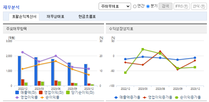 -2023년 9월 전년동기 대비 연결기준 매출액은 17.7% 감소, 영업이익은 46.1% 감소, 당기순이익은 46.1% 감소. 동사 최대고객사인 인피니온, ST마이크로또한 각각 말레이시아, 태국에 신공장증설을 발표하였으며, 2024년 증설 완료 후 공급 물량 확대가 기대됨. 기존 DDR4향 패키징 기판 매출 감소 영향으로 3분기 실적은 저조하였으나 DDR5 패키징 기판의 매출 확대를 통해 개선 효과를 나타낼 것으로 보임.