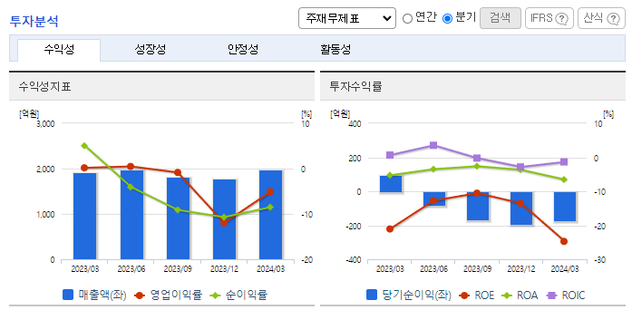 -2024년 3월 전년동기 대비 연결기준 매출액은 2.5% 증가, 영업이익 적자전환, 당기순이익 적자전환. 운반비 상승, 분쟁지역으로 인한 수출감소 등으로 인한 영업부진 등으로 인하여 영업이익이 대폭 감소함. 당분기말 현재 연결회사의 유동부채가 유동자산을 265,615백만 원 초과하고 있음. 이러한 상황은 연결회사의 계속기업으로서의 존속능력에 유의적 의문을 초래함.