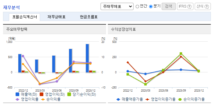 -2023년 9월 전년동기 대비 연결기준 매출액은 16.2% 증가, 영업이익 적자전환, 당기순이익 적자전환. 2차 전지 공정 자동화 컨설팅 전문 인력들을 확보하며 한국타이어 미국 공장에 1,000억원 규모 스마트물류 시스템을 수주함. 2023년 4월 약 1천억원 가량의 2차전지 자동화 설비 수주를 확보하며 지속적인 2차전지 자동화 설비 수주를 확보하여 사업을 확장시켜 나갈 계획 중임.