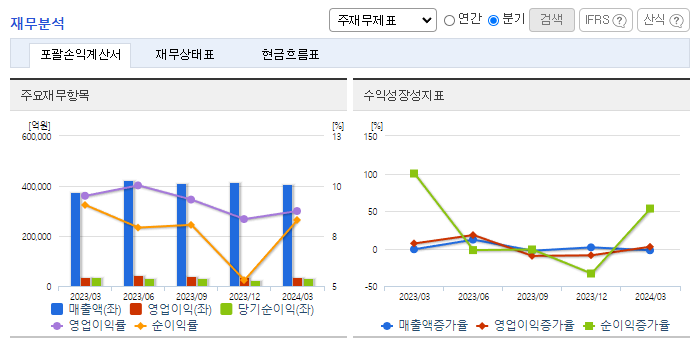 -2024년 3월 전년동기 대비 연결기준 매출액은 7.6% 증가, 영업이익은 2.3% 감소, 당기순이익은 2.4% 감소. 차량부문은 견조한 성장세를 이어가고 있으며, 캐피탈 및 카드 등 금융계열사 또한 실적 상승세 시현함. 반면 각종 비용 증가에 따라 수익성은 소폭 하락한 모습. 우수한 품질과 상품성으로 바탕으로 실적 상승 및 브랜드 가치 상승하고 있는 점 긍정적으로 평가.