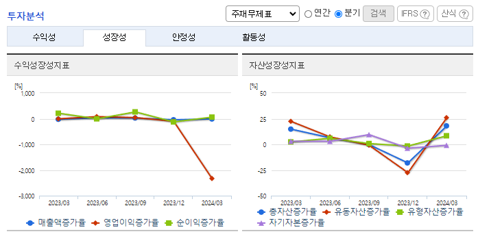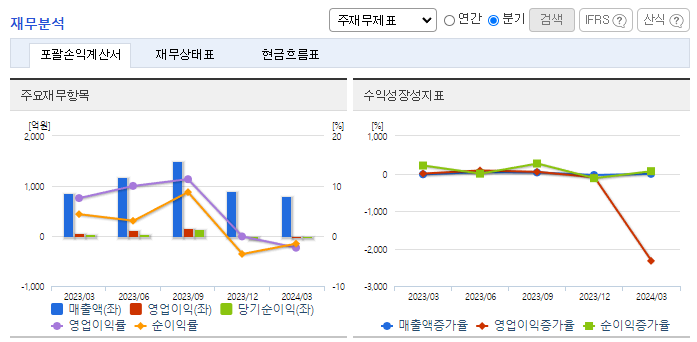 -2024년 3월 전년동기 대비 연결기준 매출액은 5.8% 감소, 영업이익 적자전환, 당기순이익 적자전환. 전년에 비해 글로벌 경기침체로 인하여 주요 바이어의 오더가 감소하여 매출액과 수익성이 소폭 감소하였고, 글로벌 금리 상승과 환율의 변동으로 인한 영업 외 비용의 증가로 당기순이익 역시 감소하였음. 애슬레저 시장의 빠른 성장에 힘입어 ATHLETA 매출이 빠르게 증가하고 있음.