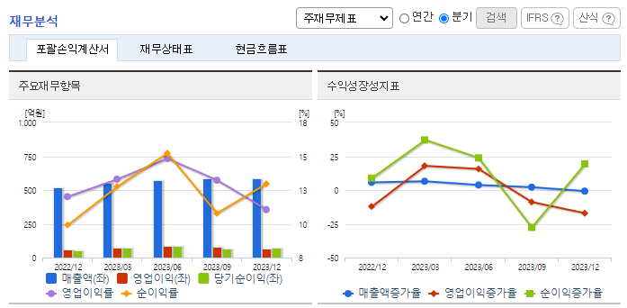 -2023년 12월 전년동기 대비 연결기준 매출액은 15.8% 증가, 영업이익은 1.2% 증가, 당기순이익은 24.5% 증가. 실적 개선 요인으로는 당기부터 GSK로부터 도입 독점 공급하고 있는 신경계 약물의 매출 증가와 쿠에타핀정 등의 기본 정신신경용제 매출 증가가 꼽힘. 조현병치료제를 비롯한 정신신경용제는 환자의 증가 등으로 매년 꾸준히 시장이 성장하고 있고 당사의 매출도 증가하고 있음.