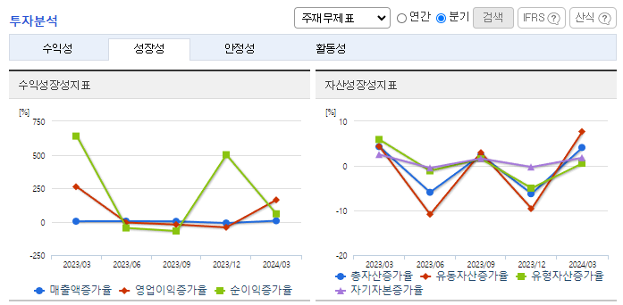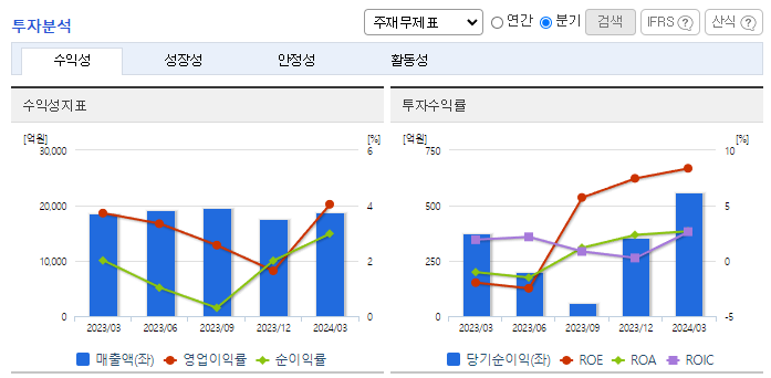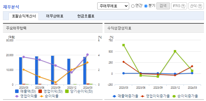 -2024년 3월 전년동기 대비 연결기준 매출액은 1% 증가, 영업이익은 9.7% 증가, 당기순이익은 42.9% 증가. 동사는 글로벌 네트워크 공조로 국내 생산 제품 수출 증대 및 거래 확대를 추진하여 매출을 안정화시키고 있으며 이에 따라 수익성도 증가하였음. 친환경 제품 중심으로 재편되고 있는 글로벌 소재 시장에 선제적 대응하기 위해 Bio-BDO 생산 공장을 신설할 계획임.
