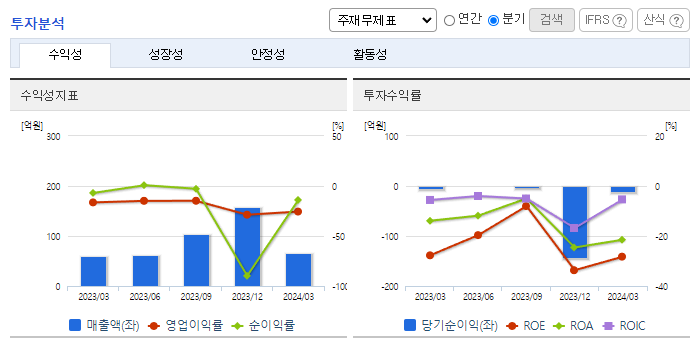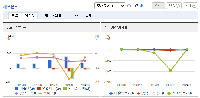 -2024년 3월 전년동기 대비 연결기준 매출액은 10.6% 증가, 영업손실은 72.5% 증가, 당기순손실은 94.7% 증가. 매출액은 증가했지만, 판관비가 110.10% 증가하면서 영업이익에 악영향을 줌. 특히 인건비 및 복리후생비가 166.9% 증가하면서 판관비를 크게 상승시킴. 국내의 경우 키즈폰과 모바일 라우터 모두 통신사에 직접 공급하고 있으며 말레이시아, 호주 등도 통신사에 직접 판매하고 있음.