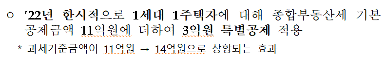 2022년 세제개편안내용을 살펴보면 2] 민생안정 부분에 4) 부동산세제 정상화 내용이 기재되어 있다.