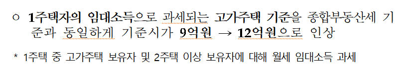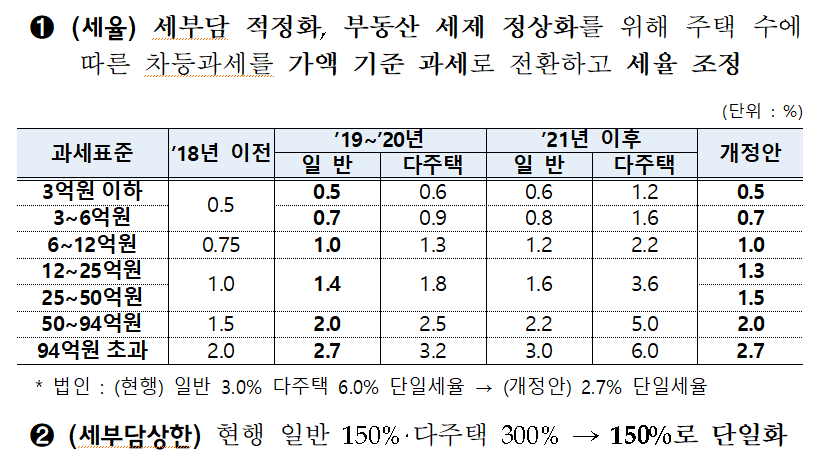 다주택자에게 부과되던 종합부동산세 세율을 조정, 주택 수에 상관없이 과세표준으로만 세율이 결정되는 안이다.
