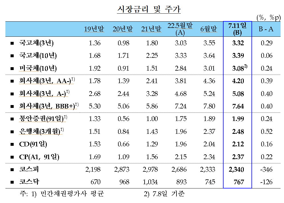 국고채 금리는 작년 대비 큰 폭으로 상승하였다가, 6월 하순 이후 글로벌 경기침체 우려 부각 등으로 상승폭이 축소됨.