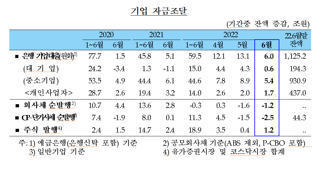 은행 기업대출 항목을 보면 2022년도 지속적으로 대출을 하고 있으며 4~5월 대비 증가폭은 감소한 것으로 보인다. 다만, 대기업의 경우 2020년 6월, 2021년 6월이 마이너스였던것과는 달리 2022년도에는 플러스이다. 이는 2012년 이후 처음이다. 중소기업의 경우 대기업보다 지속적으로 많은 대출을 받는 것으로 보인다.