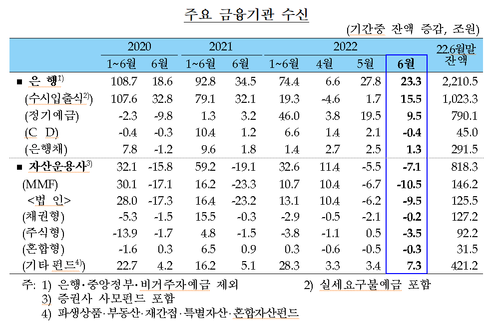 6월 중 은행 수신에 대해 살펴보면, 수시 입출식 통장으로 들어온 금액이 2022년도 들어서 큰 폭으로 확인된다. 이는 분기말 재뮙율 관리, 결제성 자금 확보를 위한 기업자금 유입 등으로 증가했다는 코멘트를 확인할 수 있으며, 정기 예금의 경우 수신 금리 상승 등으로 가계 및 기업 자금의 유입된 것으로 추정 된다.