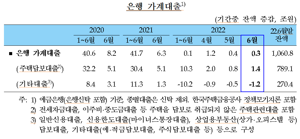 6월 중 은행 가계대출은 상승폭이 감소된 수치를 보였다. 다만 주택담보대출은 증가하였으나, 기타대출이 감소하면서 증가폭이 줄어든 것으로 보인다. 전년 동월 대비해서는 큰 폭으로 감소하였으나 이미 전년과는 분위기가 많이 다른 상황으로 대출을 받는 폭도 줄어든 것으로 보인다.