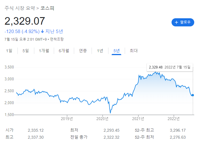 코스피는 글로벌 긴축기조 강화, 경기둔화 우려 등에 국내 주식거래 위축 등 수급요인이 더해지면서 큰 폭 하락중이다. 코로나 최대 3300 수준을 찍고 현재 많이 내려온 상황이다.