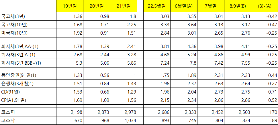 한국은행에서 매달 발표하는 금융시장 동향 보도자료 정리한 포스팅이다. 시장 금리 및 주가  국고채 금리는 작년 대비 큰 폭으로 상승하였다가, 6월 하순 이후 글로벌 경기침체 우려 부각 등으
