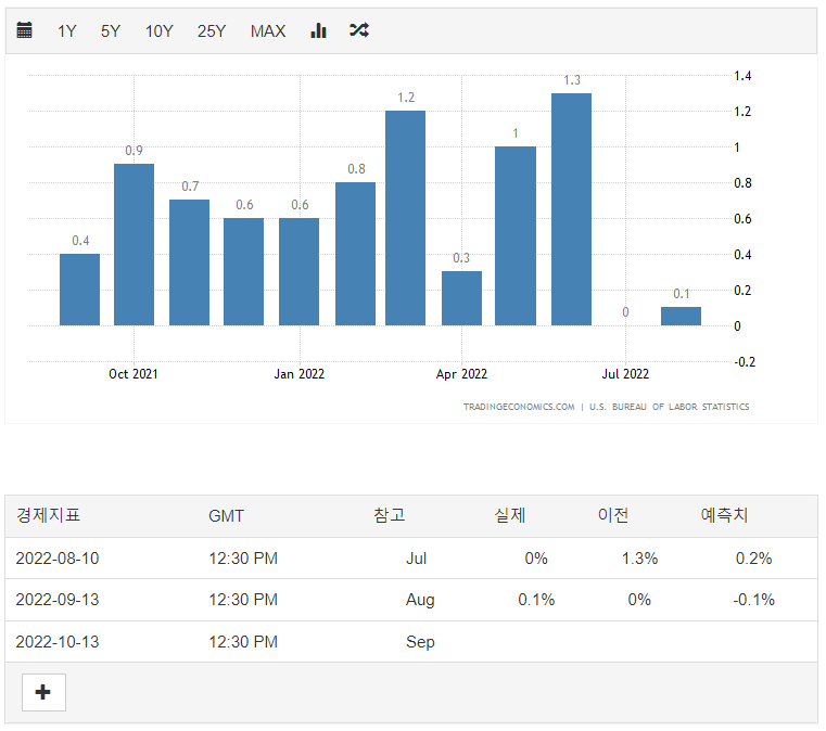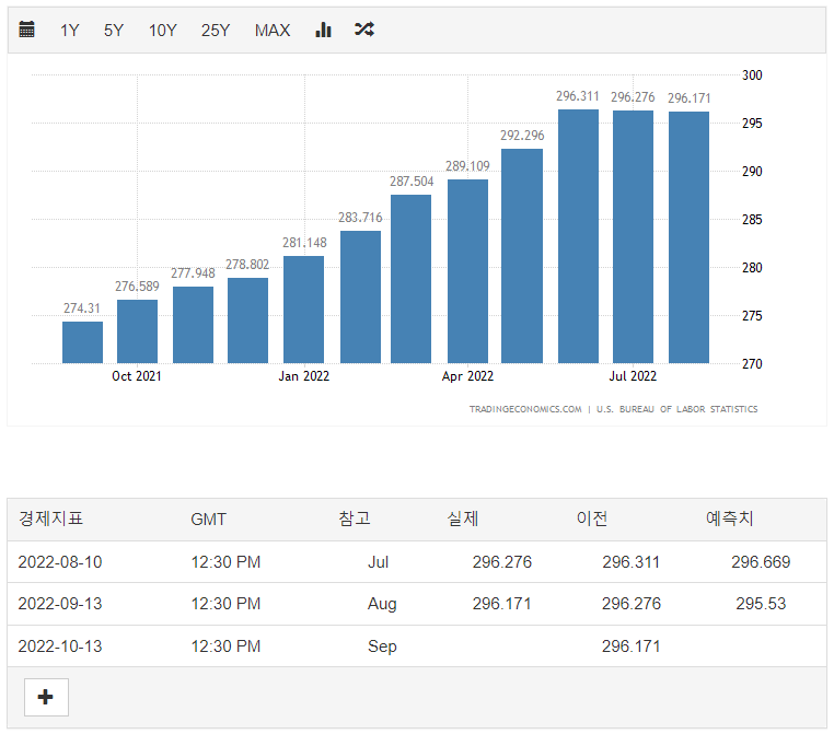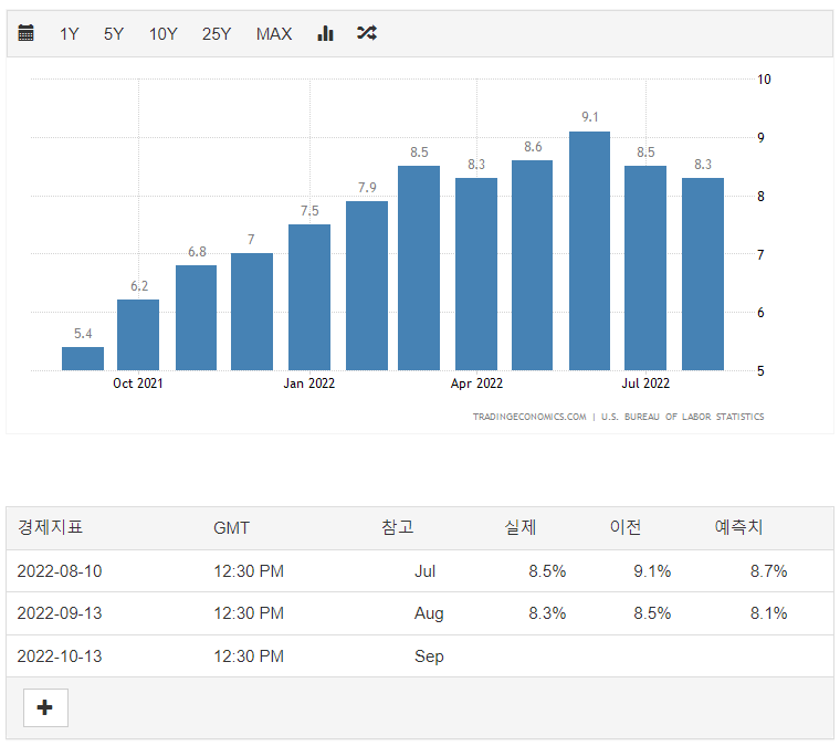 22.09.13 에 8월달 미국 소비자 물가 지수(CPI) 및 물가 상승률이 발표되었다. 지금까지 지수의 상승폭이 상당하였으나, 지난달(8월)에 7월 지수는 약간 주춤하는 추세였다. 그러면 9월 지수를 확인해보자.