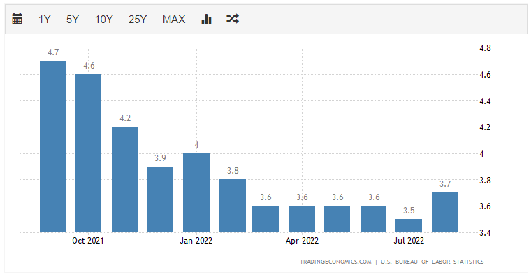 -> 금리를 높히면서 어느정도 경제가 망가지는 것을 감수한다고 하였다. 그렇다면 다른 지표들이 어디까지 망가지는 것을 허용할 것인지? 를 보는 것도 중요할 것이다. 그 중에 하나는 실업률을 생각해보았다. 실업률도 8월에 다시 올라가고 있다. (하지만 요새 사람을 구하기 너무 어렵다는 뉴스도 있기 때문에 고민을 해야할 것 같다.)