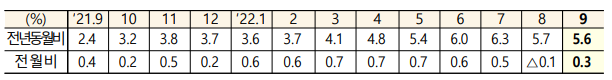- 9월 소비자 물가는 전년동월비 5.6%, 전월비 0.3% 상승을 보였다.