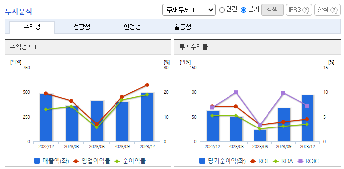 -2023년 12월 전년동기 대비 연결기준 매출액은 0.8% 감소, 영업이익은 8.6% 증가, 당기순이익은 32.9% 감소. 매출감소에도 불구하고, 매출원가, 판관비를 줄이는 데 성공하면서 영업이익은 소폭 증가함. 동사는 변화하는 시장 상황에 대응하고자 온라인 유통 채널의 확장, 오프라인 유통 채널의 효율적인 관리 및 신제품 개발 강화를 목표로 사업을 운영하고 있음.