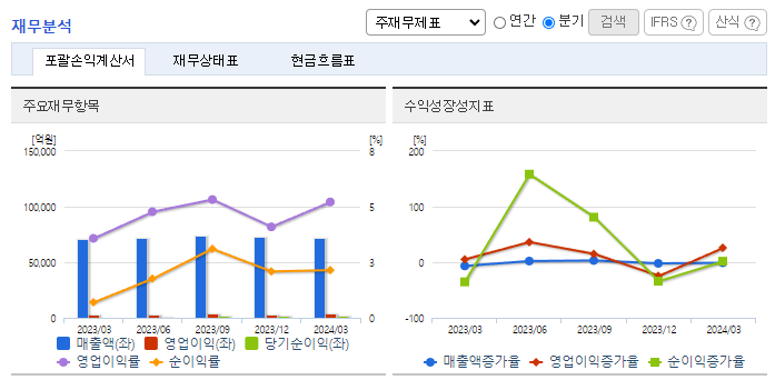 -2024년 3월 전년동기 대비 연결기준 매출액은 2% 증가, 영업이익은 48.7% 증가, 당기순이익은 1287% 증가. 해외에서는 특히 미주 주력 제품인 만두와 피자의 시장 점유율 1위 지위가 강화되고, 유럽ㆍ호주 등 신영토에서 K-Food 확장으로 인한 수익구조 개선됨. 해외 주요 지역 판매량 증가를 통한 매출 성장과 더불어 비용 효율화에 따른 판관비 절감 등으로 해외 매출과 이익 모두 전년대비 증가함.