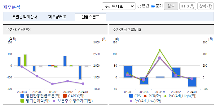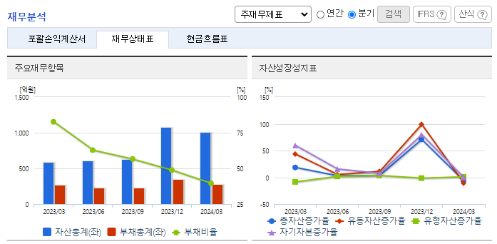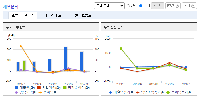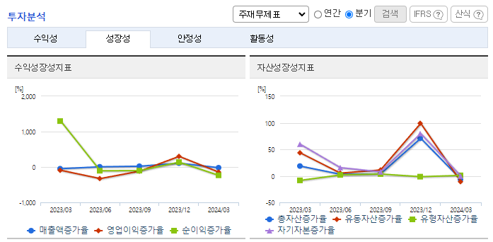 -2024년 3월 전년동기 대비 별도기준 매출액은 118.7% 증가, 영업이익 적자전환, 당기순이익 적자전환. 2024년 1월부터 합병된 회사의 매출이 인식되어 전년 동기 대비 매출이 상승하였음. 새로운 사업부가 추가됨에 따라 원재료의 비중이 커지고 외주 가공비가 증가하여 영업이익이 적자로 전환됨. 2023년 12월 건축사업을 담당하는 인스빌 합병에 따라 손익이 반영되어 외형적으로 성장함.