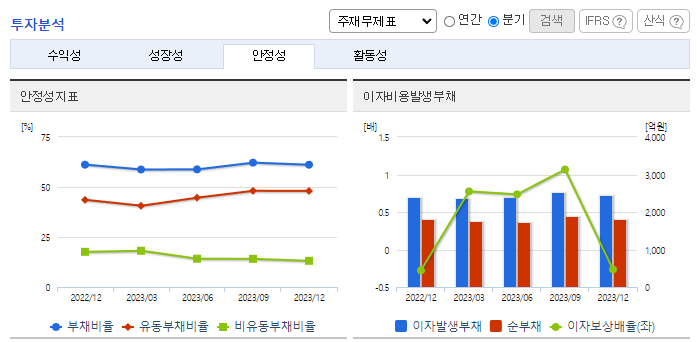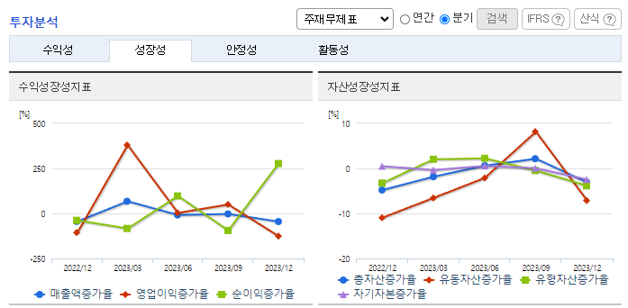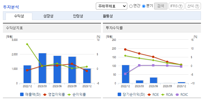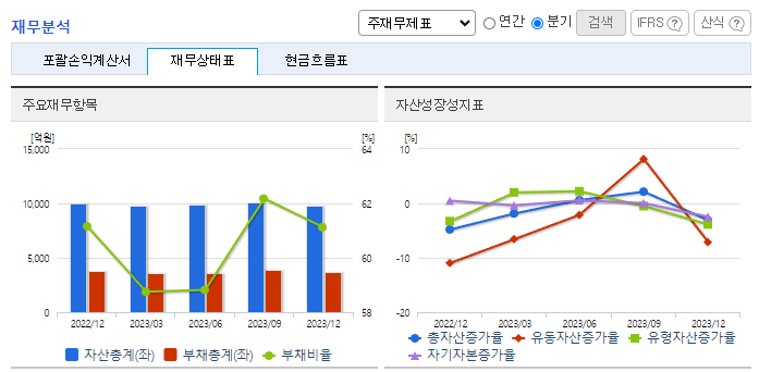 -2023년 9월 전년동기 대비 연결기준 매출액은 17.6% 감소, 영업이익은 84.4% 감소, 당기순이익은 92.1% 감소. 섬유소재부문의 경우 거래 품종의 다양화와 거래처 다변화를 시도하고 있으나 전반적인 경기침체와 의류 소비 부진으로 해당 사업부문의 매출이 17.4% 감소함. 2차 전지 산업 수요에 맞춘 대규모 생산라인 증설을 위해 청주공장 신설을 확정하였으며 현재 청주하이테크밸리와 토지 매매계약을 체결한 상태임.