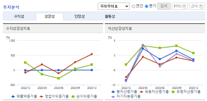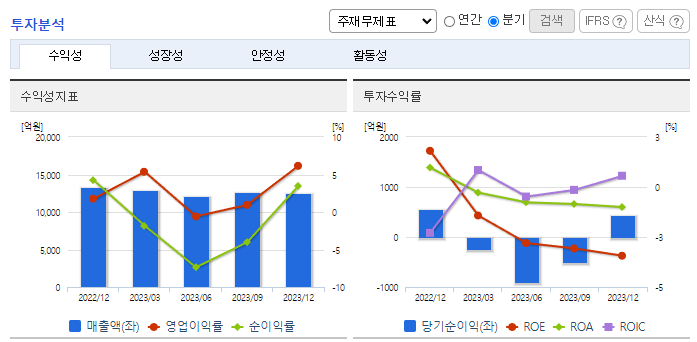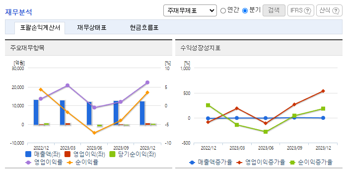 -2023년 9월 전년동기 대비 연결기준 매출액은 1.9% 감소, 영업이익은 71.6% 감소, 당기순이익 적자전환. 석유화학제품 사업부문은 글로벌 경기침체 및 중국의 대규모 증설 등 어려운 대외 환경의 영향으로 매출이 감소하였고, 투자 사업부문은 자회사 배당수익 감소 등으로 매출이 감소하였음. 자동차부품 사업부문은 전기차 확산에 발맞춰 배터리와 구동모터 부품을 수주하며 본격적인 양산에 돌입하였음.