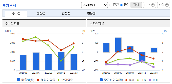 -2023년 12월 전년동기 대비 연결기준 매출액은 11.5% 증가, 영업이익은 196% 증가, 당기순이익은 901.4% 증가. 외형이 커진 가운데 원가율이 다소 악화되었으나 판관비가 크게 감소함에 따라 영업이익은 큰 폭으로 증가함. 기술 배양을 통해 신시장 개척, 제품 다각화에 대한 노력을 기하고 있으며, 기존제품에 대한 생산효율성 향상, 수요처 다변화를 통하여 성장을 이루어 나갈 계획임.