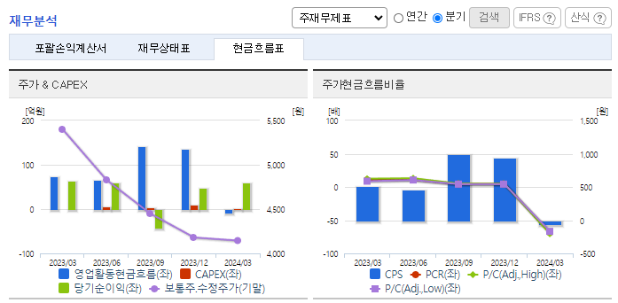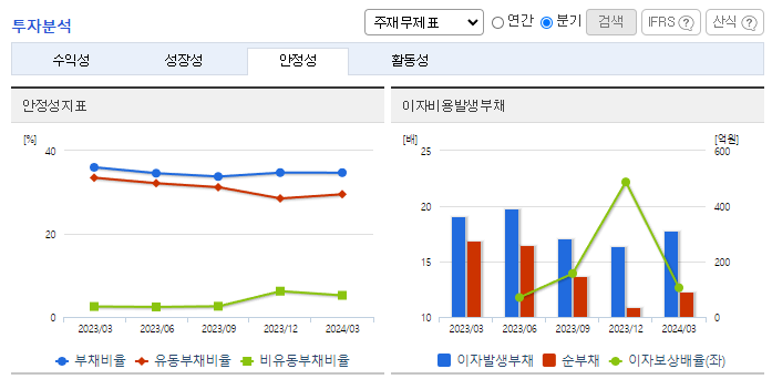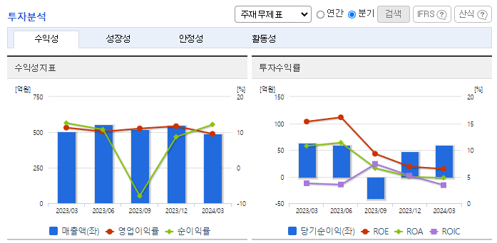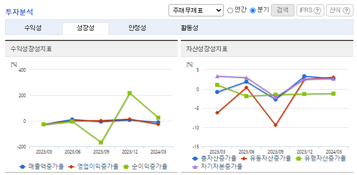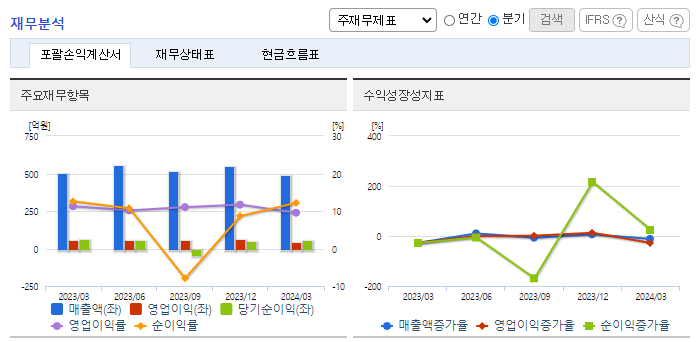 -2024년 3월 전년동기 대비 별도기준 매출액은 3.1% 감소, 영업이익은 18.1% 감소, 당기순이익은 6% 감소. 거시경제의 불확실성이 지속되어 소폭 매출이 감소하였음. 판관비중 기타 비용이 상승하였고 이에 따라 영업이익이 좀 더 큰 폭으로 감소함. 핵심사업이 후발국의 저가공세로 경쟁이 심화되고 있으나, 신제품 개발 및 고부가가치 제품의 확대로 적극적으로 시장을 개척 중.