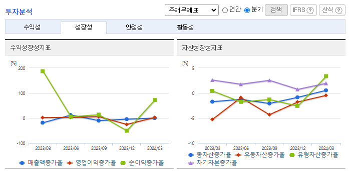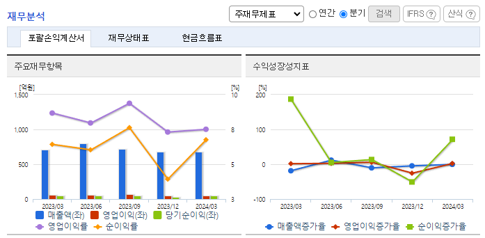 -2023년 12월 전년동기 대비 연결기준 매출액은 20.8% 감소, 영업이익은 32.2% 감소, 당기순이익은 27.2% 감소. 환율 상승과 원자재 가격 상승에 따른 판매 감소로 매출액과 영업이익이 감소함. 동사는 지속 성장의 기반을 마련하기 위해 해외 시설 투자를 확대하고, 제품의 품질 향상과 생산 효율성 증대를 위해 연구 개발에 집중함으로써 경쟁력 향상과 고객가치 증대에 힘쓰고 있음.