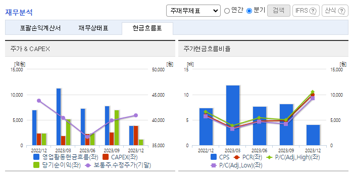 -2023년 9월 전년동기 대비 연결기준 매출액은 9.9% 감소, 영업이익은 27.8% 감소, 당기순이익은 39.2% 감소. GS칼텍스는 정제마진 효과로 이익이 양호하였던 반면, GS EPS는 직도입 LNG 생산 투입 시기 지연되며 예상을 하회하였음. 기존 사업의 안정적인 현금창출 능력을 바탕으로 리사이클, 전기차, 배터리, 친환경 등을 핵심 성장사업군으로 선정해 적극적으로 역량을 확대하고 있음.