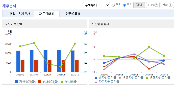 -2023년 12월 전년동기 대비 연결기준 매출액은 0.7% 증가, 영업이익은 7.4% 증가, 당기순이익은 1530.4% 증가. 매출은 전년도 수준을 유지하고 있으며, 주요 관계회사 이익 증가에 따른 지분법 이익 증가로 순이익은 큰 폭의 증가세를 보임. 부품 제조업체와의 전략적 파트너십을 통하여 자동차 정비에 필요한 After Market용 순정부품을 공급받아 전국 30여 개의 유통 네트워크를 통하여 안정적으로 공급 판매함.