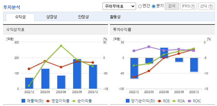 -2023년 12월 전년동기 대비 연결기준 매출액은 26.8% 증가, 영업손실은 15.9% 증가, 당기순손실은 79.7% 감소. 시장 수요가 높아 매출은 안정적으로 성장하고 있으나 원가가 크게 증가하여 수익성은 감소하였음. 질병관리청에서 주관하는 204억 원 규모의 '코로나백신 유통 사업' 수주권을 단독 확보하여 국내 콜드체인 유통 판매에 있어 앞설 수 있는 교두보를 마련하였음.