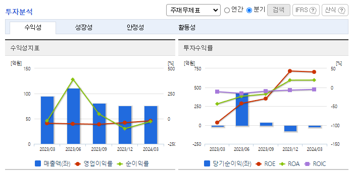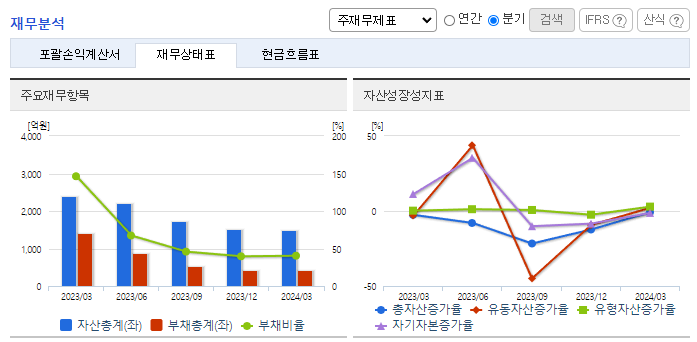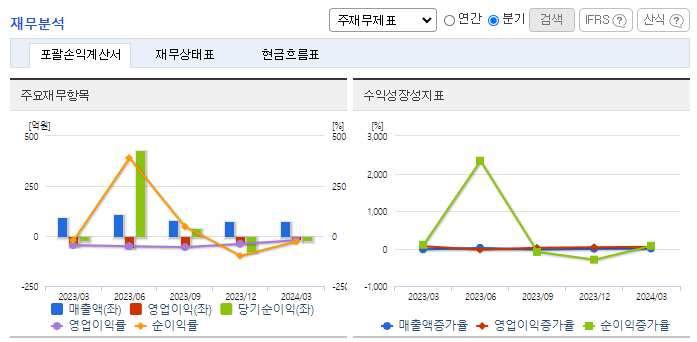 -2024년 3월 전년동기 대비 연결기준 매출액은 19.7% 감소, 영업손실은 62.7% 감소, 당기순손실은 16.2% 증가. 2023년 8월 31일 부로 숏폼 온라인동영상서비스(OTT) 바바요 서비스를 종료하였음. 2023년 사업보고서 기준 전환사채의 전환청구의 영향으로 자본금이 104,311백만 원 감소하였으나 당기순이익의 증가로 자본총계는 전년 대비 21,133백만 원 증가.