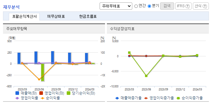 -2023년 12월 전년동기 대비 연결기준 매출액은 1.5% 증가, 영업이익은 31.3% 증가, 당기순이익 적자전환. 내과품목중심의 영업기반으로 제품 포트폴리오를 정비하고 신약 개발에 투자하면서 매출이 점진적으로 성장하고 있음. SK케미칼과 스카이조스터주 공동판매 협약을 체결하여 영업하고 있고 갈더마코리아의 오리지널 제품 독점 판매 계약을 체결, 성장가치가 높은 클리닉 시장에서 경쟁력을 더욱 강화하고 있음.