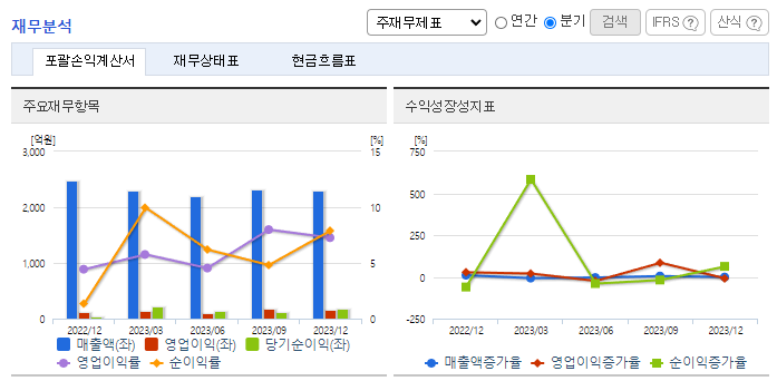 -2023년 12월 전년동기 대비 연결기준 매출액은 7.4% 감소, 영업이익은 25.5% 증가, 당기순이익은 126.8% 증가. 2023년 설비증설과 공정개선 등 시설투자를 하였으며, 경쟁력 강화와 미래 수요 증가에 대응해 시장 변화에 맞게 점검하여 탄력적으로 추진할 예정임. 2023년 말레이시아 쿠알라룸푸르, 인도네시아 자카르타 및 태국 방콕에 제조 및 판매법인을 두고 해외 신규 거래처를 발굴하고 기술서비스 제공에 힘쓰고 있음.