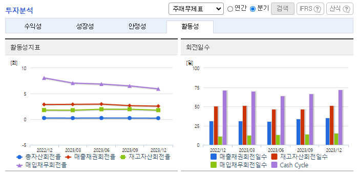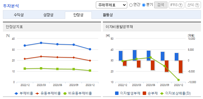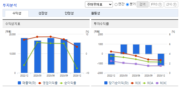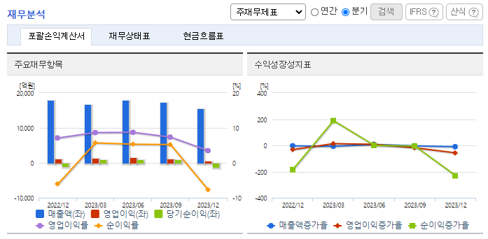 -2023년 9월 전년동기 대비 연결기준 매출액은 2.6% 감소, 영업이익은 25.8% 감소, 당기순이익은 24.2% 감소. 유통사의 수익성 중심 경영 기조 지속과 중국 수요 약세로 면세점 채널 매출은 전년동기 대비 25% 감소했고, 중국 화장품 매출은 전년 동기 대비 34% 하락함. 일본 대표 온라인 쇼핑몰 큐텐(Qoo10)에 화장품을 출시한 지 약 6개월 만에 300%에 달하는 매출 신장률을 기록함.