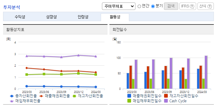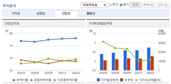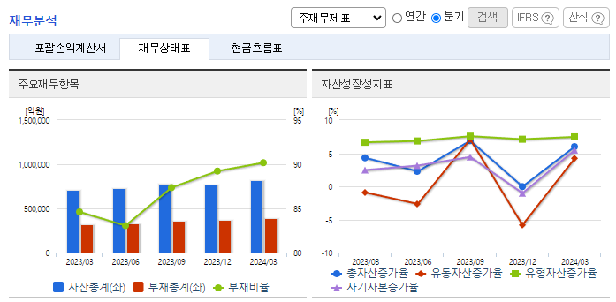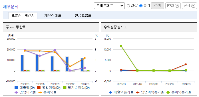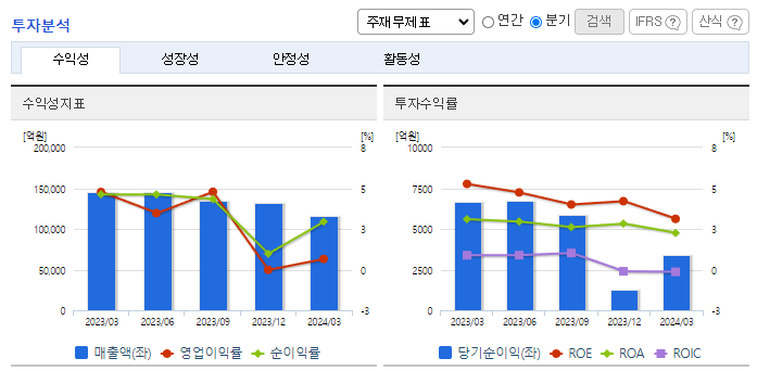 -2024년 3월 전년동기 대비 연결기준 매출액은 18.7% 감소, 영업이익은 89.2% 감소, 당기순이익은 71.2% 감소. 원통형 전지 매출 증가에도 전기 사업부문은 전기차 수요 둔화와 메탈가 하락에 따른 판가 하락. 석유화학 부문 POE 등 고부가 제품 지역 다변화를 통해 성장 도모. 전기 사업부문의 경우 북미 시장의 전기차 시장 성장성 유효하며 신규모델 출시하며 견조한 성장세 유지.