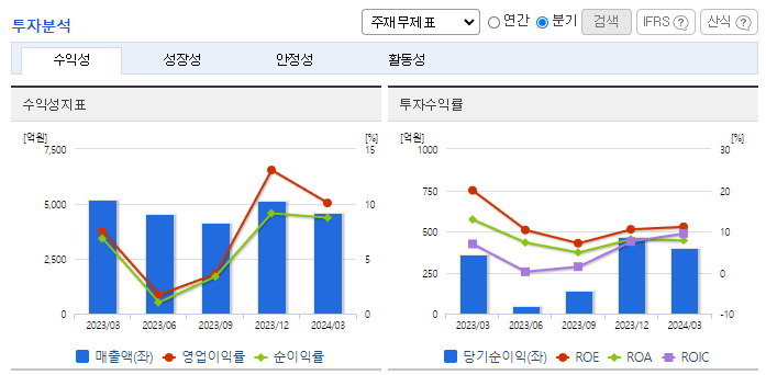 -2024년 3월 전년동기 대비 연결기준 매출액은 12.1% 감소, 영업이익은 18.1% 증가, 당기순이익은 12.3% 증가. 동사의 주요 고객인 LG디스플레이의 부진으로 매출 및 영업이익 급감하였으며 디스플레이 구동칩 DDI 가격이 하락함과 동시에 수익성도 감소하고 있음. Display 시스템 반도체 핵심 부품을 Total Solution으로 제공함은 물론 수입의존도가 높았던 제품들을 국산화하였음.